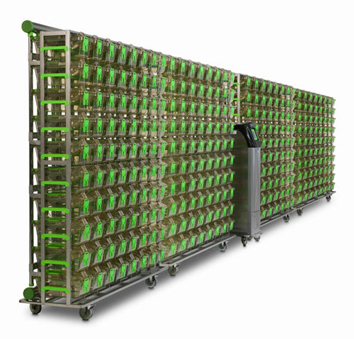 The Library Configuration mounts the air handler and the racks together on a stainless steel rail system so they can be moved together in high density applications. In this installation the Green Magnetic Connection Hoses are used to make short, fixed connections.